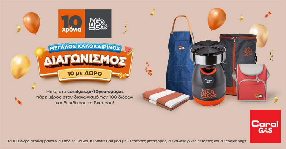 Η Coral Gas γιορτάζει τη δεκαετία παρουσίας της φιάλης GoGas, η οποία άλλαξε την εμπειρία χρήσης υγραερίου με την ελαφριά και εργονομική της σχεδίαση, προσφέροντας μέγιστη ασφάλεια με το Triple Safety System. Για να τιμήσει αυτή την επέτειο, διοργανώνει έναν καλοκαιρινό διαγωνισμό γνώσεων, προσφέροντας 100 μοναδικά δώρα, όπως Smart Grill και συλλεκτικές ποδιές.