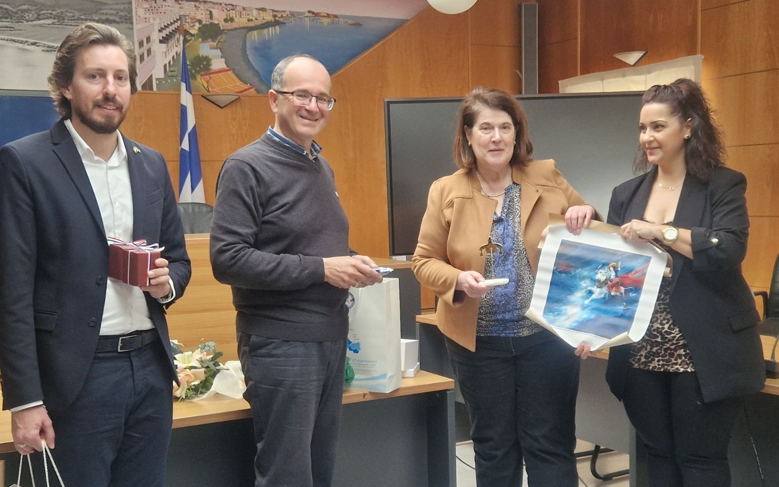 Η συνάντηση ολοκληρώθηκε με ανταλλαγή αναμνηστικών δώρων, με τους εκπροσώπους της δημοτικής αρχής να προσφέρουν συμβολικά αντικείμενα πολιτιστικής αξίας και, συγκεκριμένα, αντίγραφο της μινωικής διπλής μέλισσας των Μαλίων και αντίγραφο της Αρπαγής της Ευρώπης, έργο του ζωγράφου, Ρουσσέτου Παναγιωτάκη.