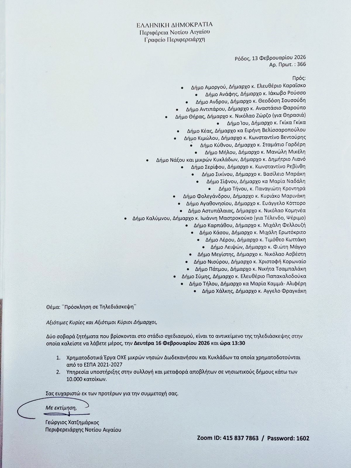 Επιστολή – πρόσκληση σε 29 Δημάρχους Κυκλάδων και Δωδεκανήσου απέστειλε ο Περιφερειάρχης Νοτίου Αιγαίου κ. Γιώργος Χατζημάρκος, με αντικείμενο τη συμμετοχή τους σε τηλεδιάσκεψη που θα πραγματοποιηθεί τη Δευτέρα 16 Φεβρουαρίου 2026 και ώρα 13:30.