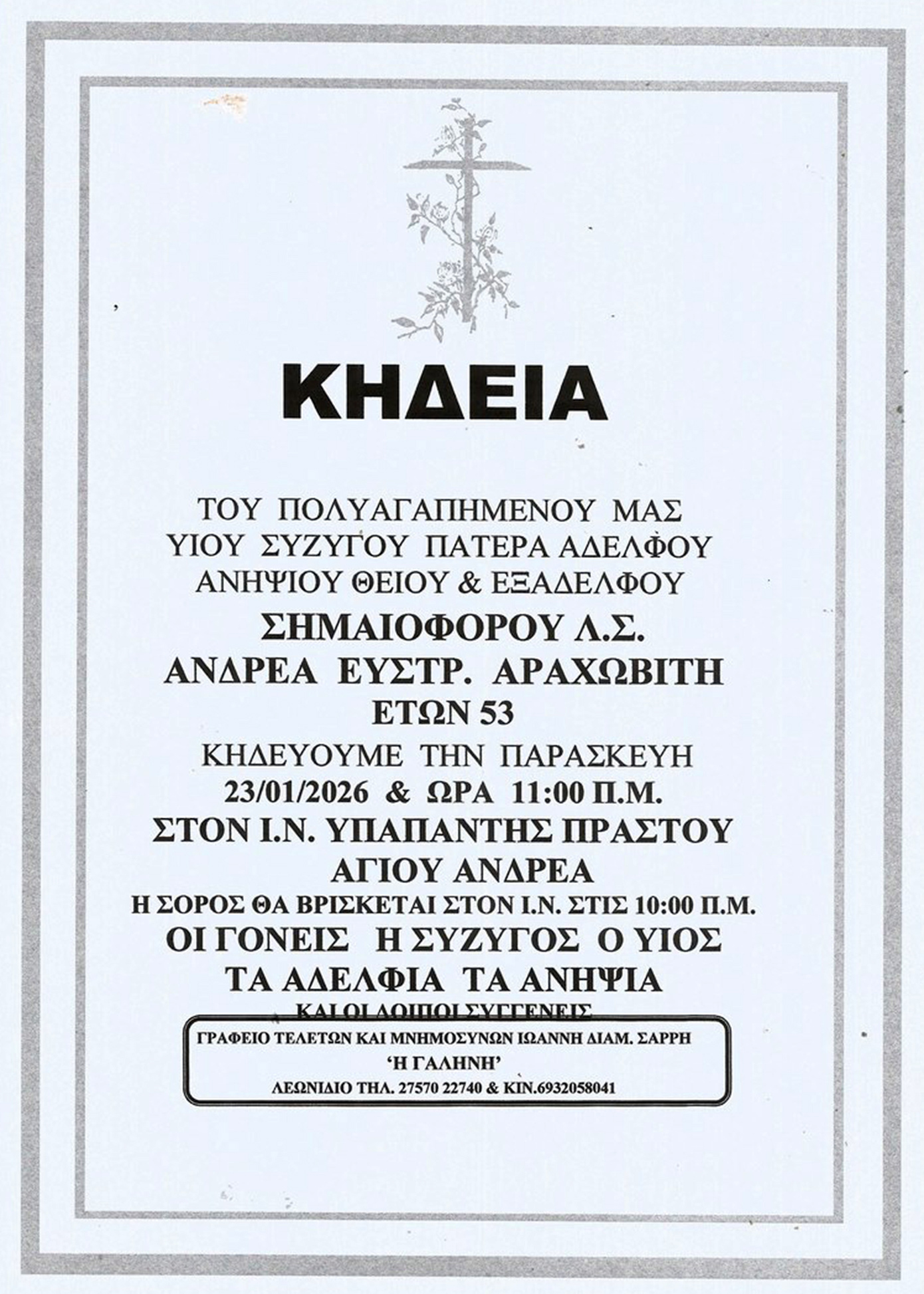 Το τελευταίο αντίο πρόκειται να πουν σήμερα, Παρασκευή 23 Ιανουαρίου, συγγενείς, φίλοι και συνάδελφοι στον 53χρονο λιμενικό, Ανδρέα Αραχωβίτη, που έχασε τη ζωή του με τραγικό τρόπο στο Παράλιο Άστρος Κυνουρίας, την ώρα που εκτελούσε το καθήκον του εν μέσω σφοδρής κακοκαιρίας.