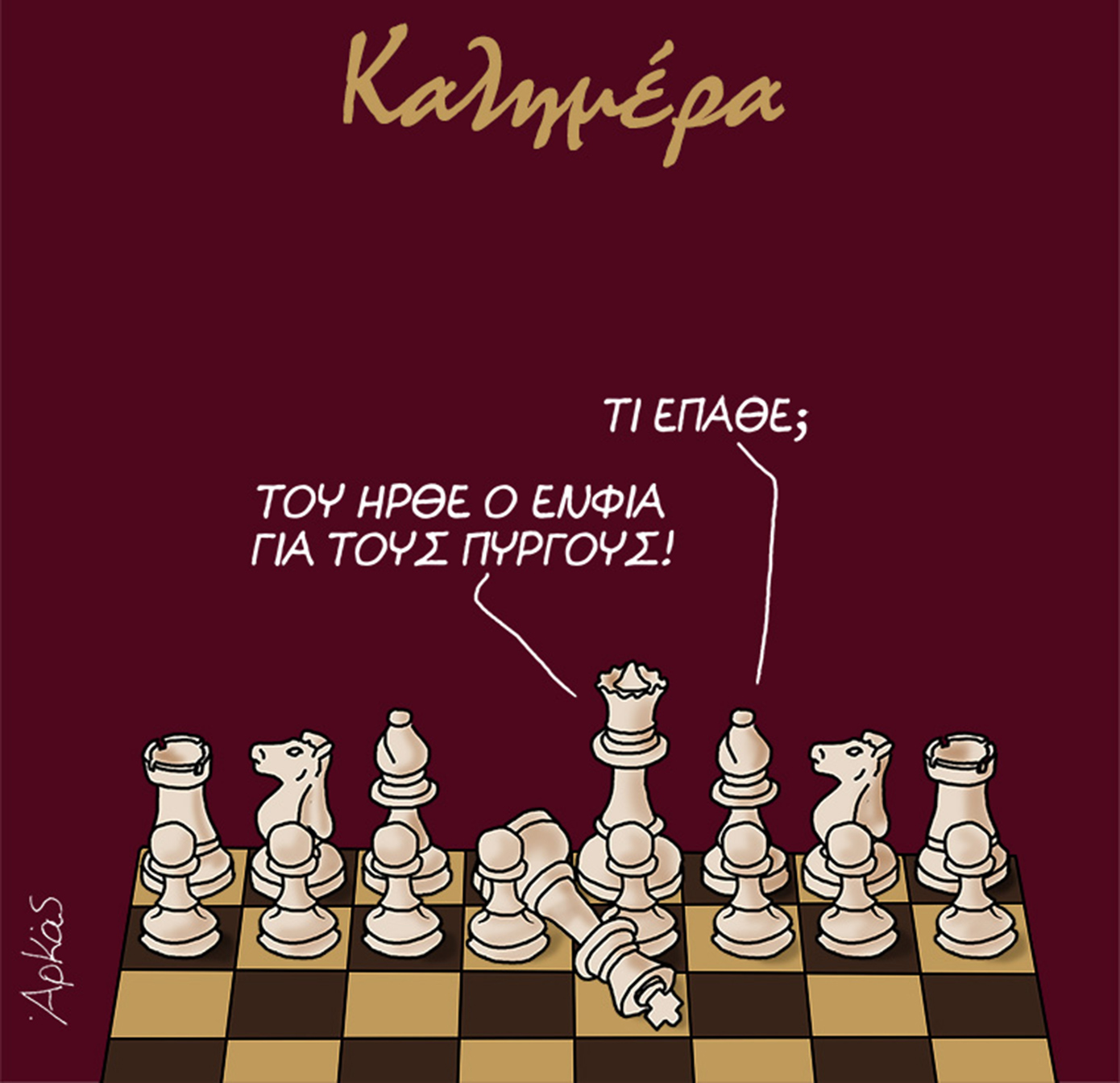 Ο Αρκάς σχολιάζει με χιούμορ τον ΕΝΦΙΑ, παρουσιάζοντας μια σκακιέρα όπου τα πιόνια ανησυχούν για τους πύργους που «πέφτουν» από τον φόρο.