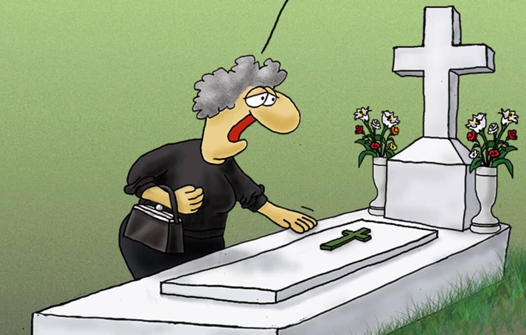 Στο σκίτσο του που δημοσίευσε στην προσωπική του σελίδα στο Facebook παρουσιάζει μια γυναίκα ντυμένη στα μαύρα να έχει επισκεφθεί το νεκροταφείο.