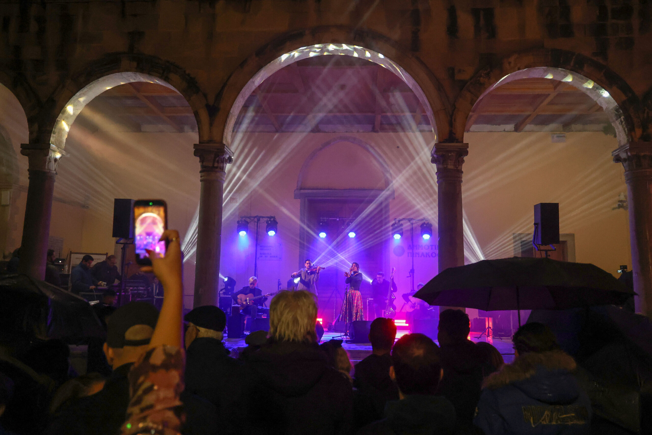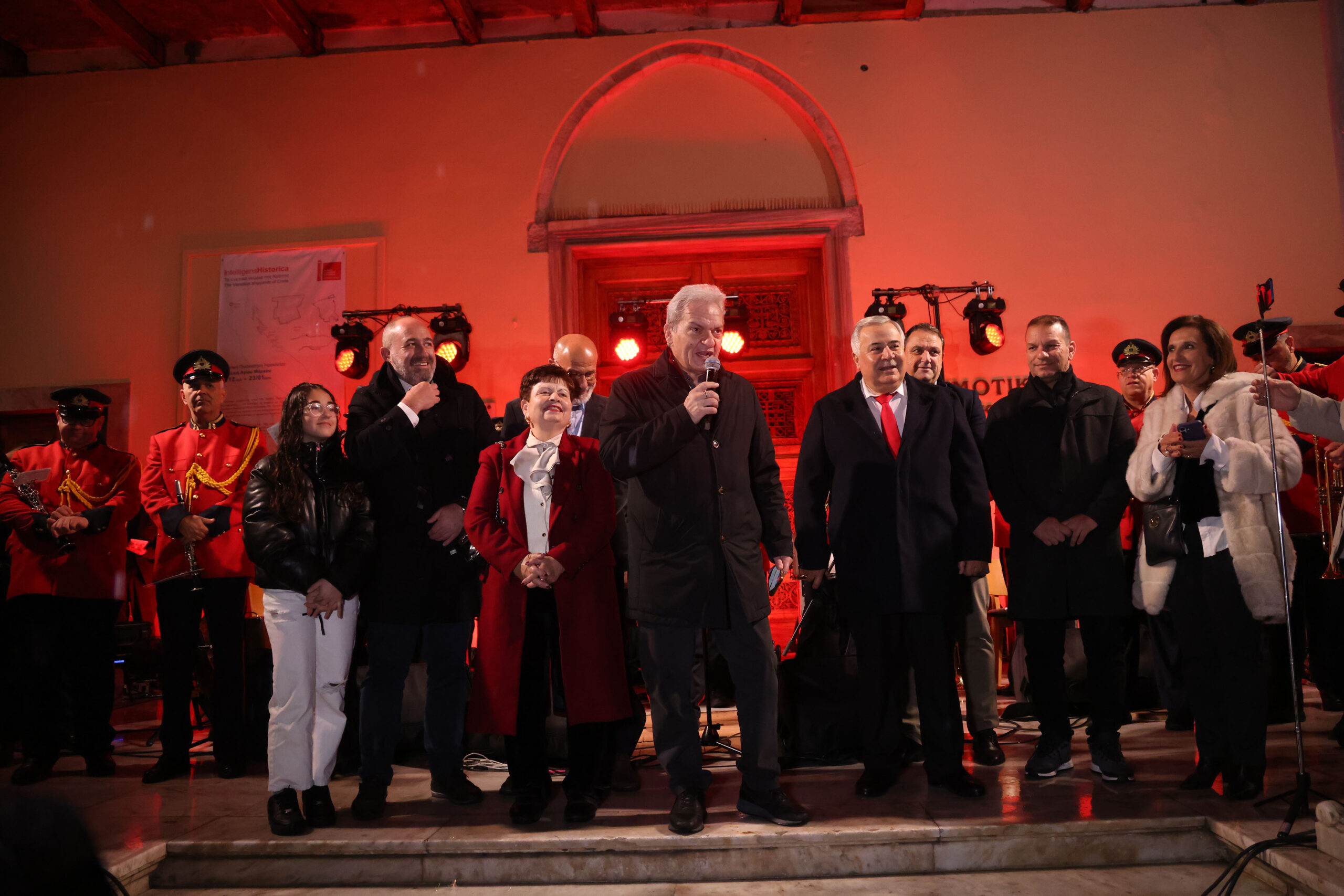 Οι άστατες καιρικές με τη βροχή που έπεφτε σχεδόν αδιάκοπα, δεν πτόησε τους Ηρακλειώτες που συμμετείχαν στις εκδηλώσεις της παραμονής της Πρωτοχρονιάς που διοργάνωσε ο Δήμος Ηρακλείου στα Λιοντάρια, στο αίθριο της Βασιλικής του Αγίου Μάρκου, με τους Gadjo DIlo και την Φιλαρμονική Ορχήστρα του Δήμου Ηρακλείου, υπό τη διεύθυνση της Αρχιμουσικού Δέσποινας Σκανδαλάκη, να συνοδεύουν μουσικά την υποδοχή του 2026.