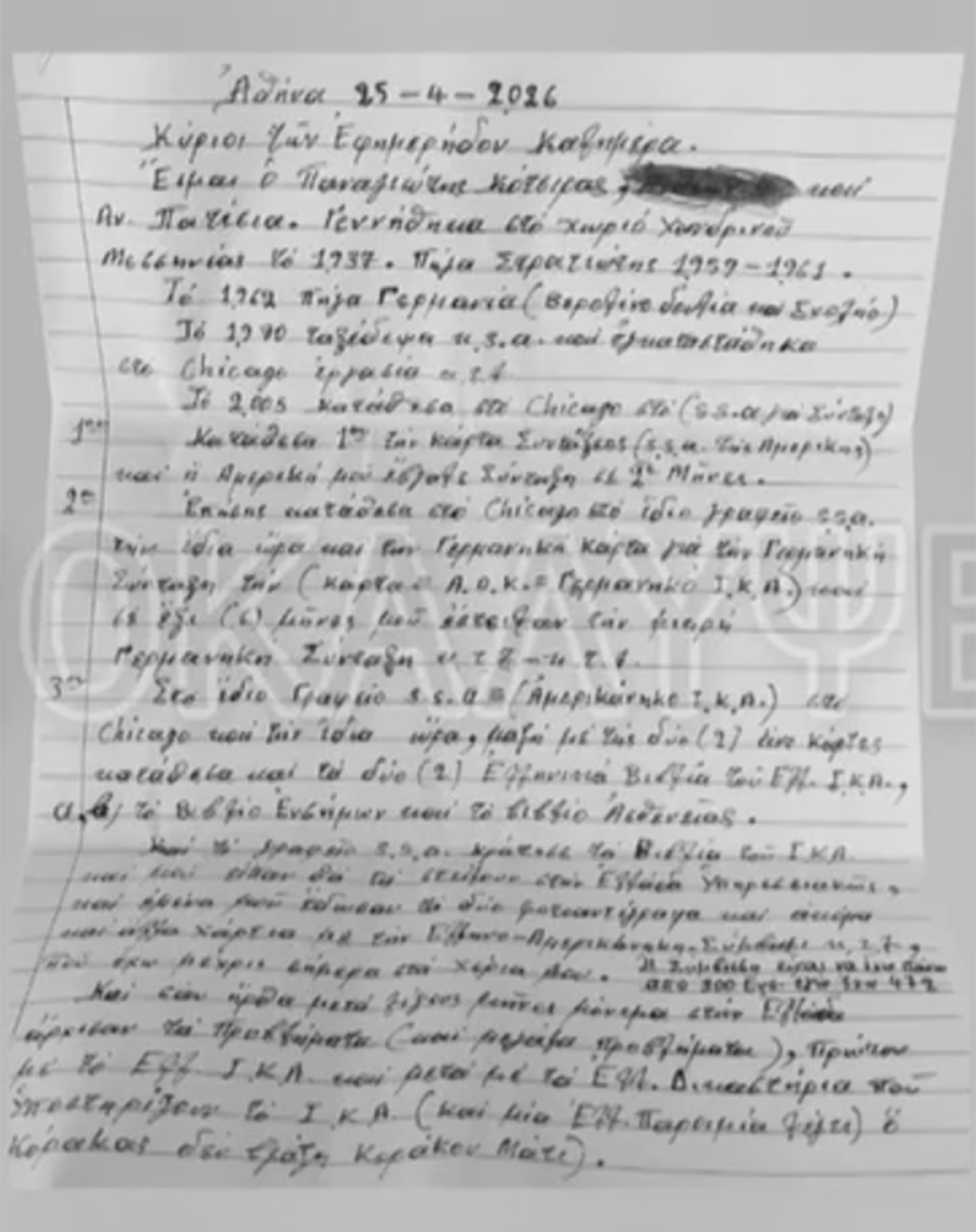 Το 1962 πήγα στο Βερολίνο για δουλειά και σχολείο. Το 1970 ταξίδεψα και εγκαταστάθηκα στο Σικάγο. Το 2005 κατέθεσα στο Σικάγο για σύνταξη και η Αμερική μου έβγαλε σύνταξη σε δύο μήνες. Επίσης, κατέθεσα στο Σικάγο τη γερμανική κάρτα και σε έξι μήνες μου έστειλαν τη μεικτή γερμανική σύνταξη.