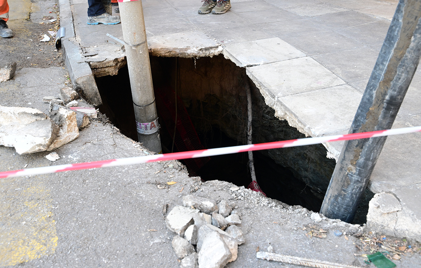 Η Τροχαία έχει διακόψει την κυκλοφορία στη Βασιλέως Γεωργίου από το ύψος της Σπύρου Μερκούρη και της Ιοφώντος από την Εργοτίμου. Παράλληλα, τα αρμόδια συνεργεία έχουν αποκλείσει το σημείο και δεν επιτρέπουν διέλευση πεζών και οχημάτων, υπό τον φόβο υποχώρησης του εδάφους.