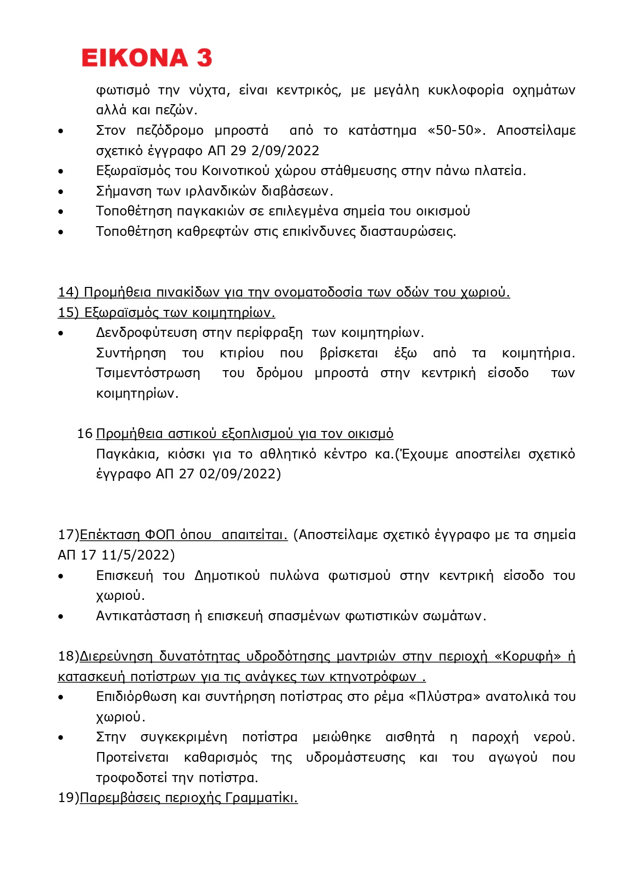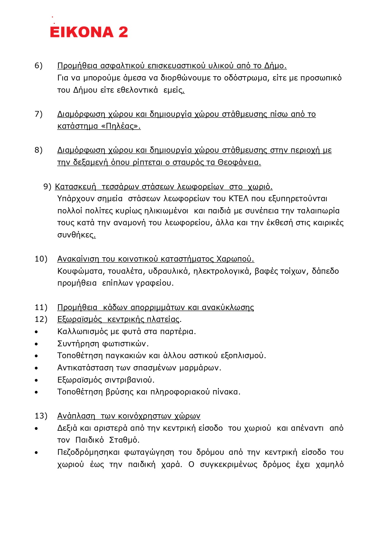 Κάθε χρόνο το Κοινοτικό Συμβούλιο καταθέτει προς τον Δήμο τις προτάσεις του, για τα έργα της Κοινότητας. Από την θητεία μου ως Πρόεδρος του Κοινοτικού Συμβουλίου μαζί με τα μέλη του, καταθέσαμε τις προτάσεις μας αφουγκραζόμενοι τις ανάγκες του χωριού, των κατοίκων άλλα και τις παλαιότερες αποφάσεις των Κοινοτικών Συμβουλίων.(φωτό 1,2,3,4)Βλέπετε η Κοινότητα έχει συνέχεια και πρέπει να λαμβάνονται πάντα υπόψη και προτάσεις παλαιότερων Συμβουλίων, αφού όλοι υπηρετούμε τα συμφέροντα της Κοινότητας.