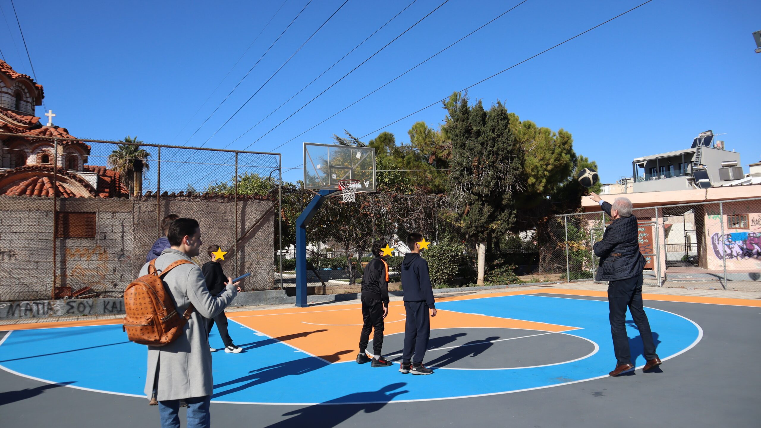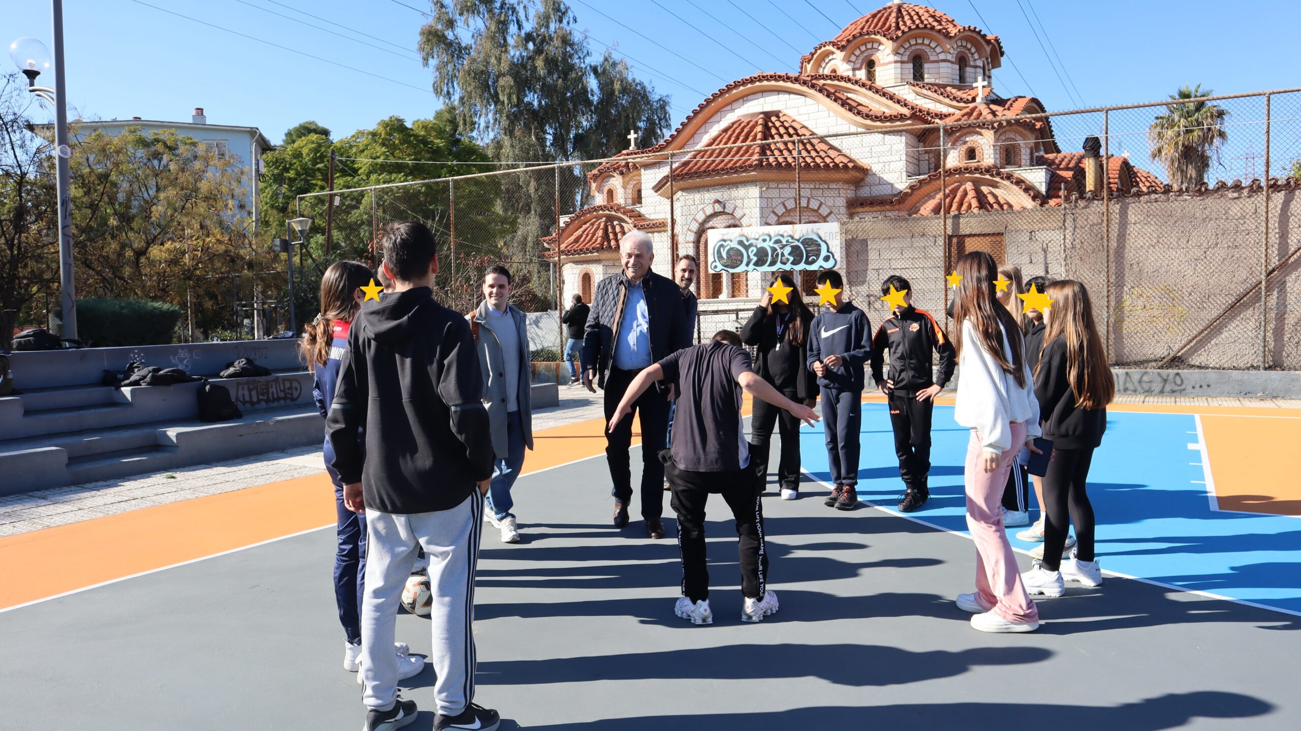 Ιδιαίτερα ξεχωριστή στιγμή αποτέλεσε η συνάντηση με μια παρέα μαθητών που βρίσκονταν στον χώρο. Ο Δήμαρχος και οι Αντιδήμαρχοι συνομίλησαν με τα παιδιά, άκουσαν με ενδιαφέρον τις σκέψεις και τα αιτήματά τους και, σε ένα ζεστό και αυθόρμητο κλίμα, αντάλλαξαν μαζί τους μερικές πασούλες στο γήπεδο μπάσκετ.