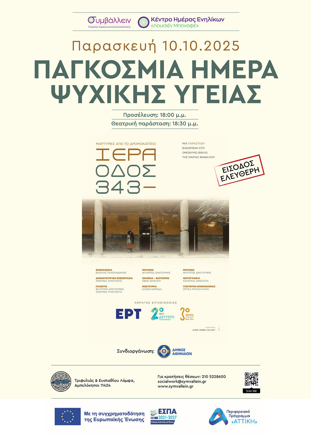 Η Αστική μη Κερδοσκοπική Εταιρεία «Συμβάλλειν», σε συνεργασία με τον Δήμο Αθηναίων, διοργανώνει μια εκδήλωση την Παγκόσμια Ημέρα Ψυχικής Υγείας, στις 10 Οκτωβρίου 2025, στο Myrtillo Cafe. Η εκδήλωση περιλαμβάνει θεατρική παράσταση με τίτλο «Ιερά Οδός 343 – Μαρτυρίες από το Δρομοκαΐτειο», βασισμένη σε μαρτυρίες από το ομώνυμο βιβλίο της Μαρίας Φαφαλιού, και ανοικτή συζήτηση.