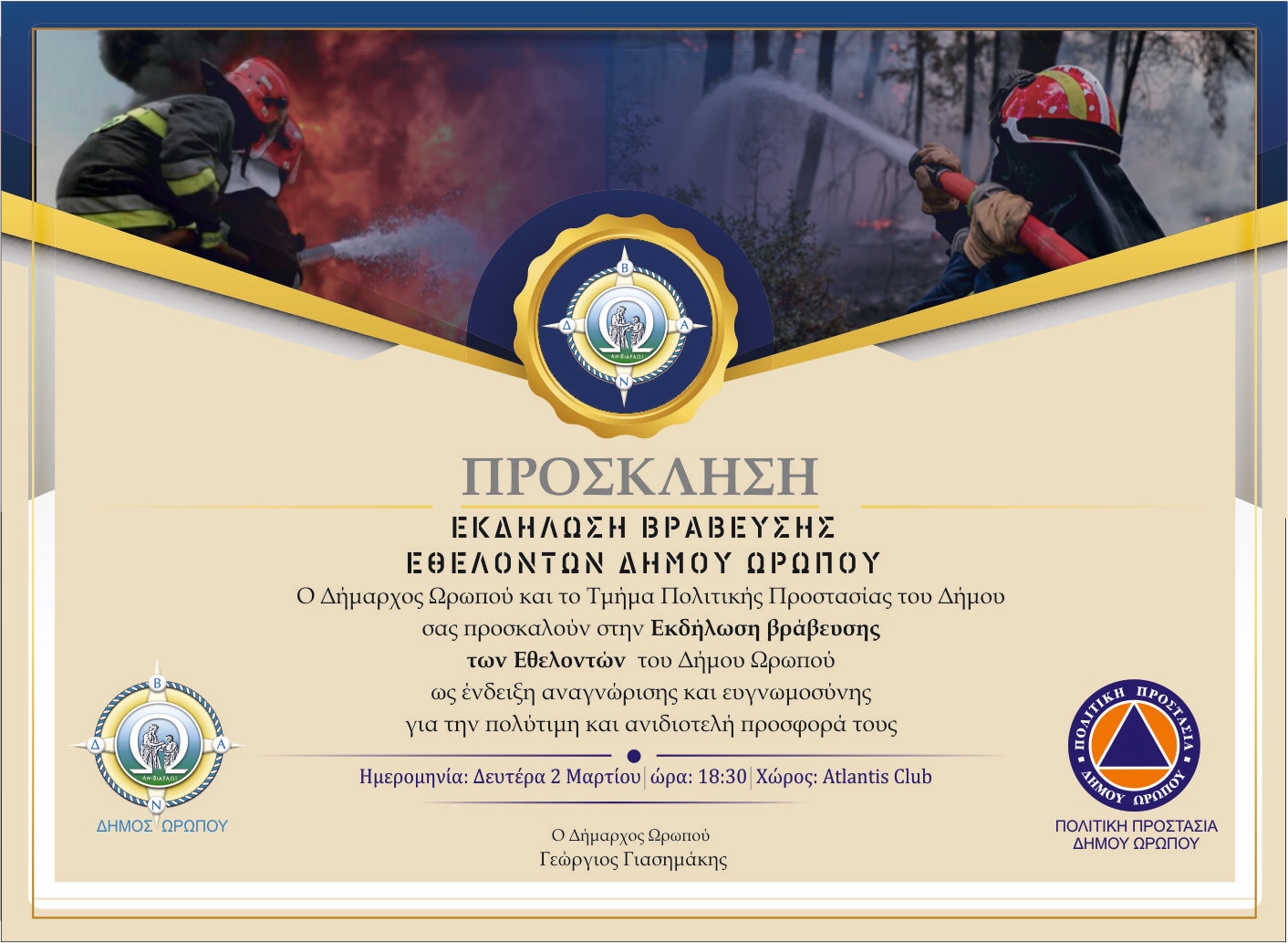 Το Τμήμα Πολιτικής Προστασίας του Δήμου Ωρωπού διοργανώνει μια ξεχωριστή εκδήλωση τιμής και αναγνώρισης για τους Εθελοντές των εθελοντικών ομάδων του τόπου και για όλους τους αφανείς ήρωες της καθημερινότητας.
